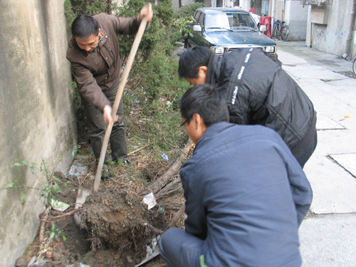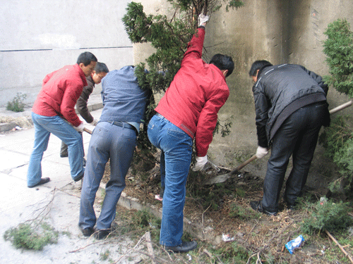 公司物料倉庫后沿的一行柏樹由于枝繁葉茂,在這次提前到來的大雪中不堪重荷,不少樹木橫臥走道,影響美觀,有礙出行。2009年11月30日下午,公司團(tuán)委組織機(jī)關(guān)部分團(tuán)員青年對(duì)被壓倒的柏樹進(jìn)行一一扶植,并修整了門前綠化帶。