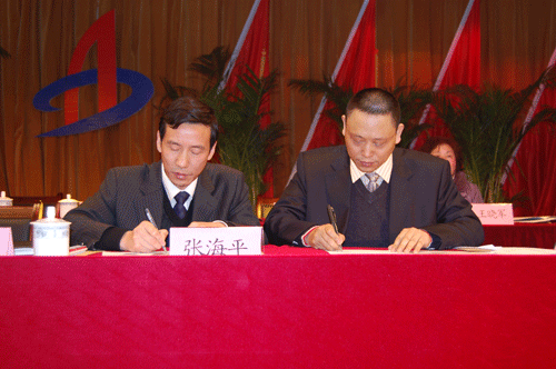 公司黨委書記李世龍與集團公司黨委書記張海平(左一)簽訂2010年黨委目標考核責(zé)任書