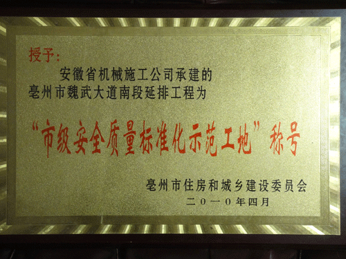 4月9日,亳州市建委與建協(xié)在市委黨校為2009年度市級(jí)優(yōu)質(zhì)工程“芍花杯”與市級(jí)“安全質(zhì)量標(biāo)準(zhǔn)化示范工地”舉行隆重的頒獎(jiǎng)儀式。我公司2008~2009年度承建的希夷大道南延道排工程與魏武大道南延道排工程雙雙獲得市優(yōu)“芍花杯”,是本獎(jiǎng)項(xiàng)中僅有的兩個(gè)市政工程,魏武大道工程獲得亳州市首個(gè)市政工程示范工地稱號(hào)。市建委總工胡常穎發(fā)表重要講話,并對(duì)我公司幾年來為亳州的建設(shè)事業(yè)所做的貢獻(xiàn)給予充分肯定與感謝。