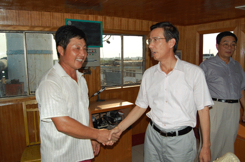 張書記(左二)與第七工程處皖吸五號(hào)船長親切交談