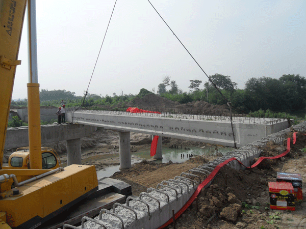 2012年7月22日9時(shí)16分,隨著施工現(xiàn)場(chǎng)鞭炮、禮花齊鳴,亳州市南擴(kuò)二路漳河橋安裝正式開(kāi)始。亳州市重點(diǎn)局副局長(zhǎng)郭來(lái)運(yùn)、第四項(xiàng)目辦主任修功華、技術(shù)組組長(zhǎng)包厚禮、南擴(kuò)二路項(xiàng)目部全體成員參加梁板安裝儀式。
