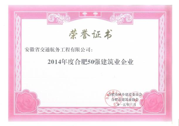 近日,合肥市建筑業(yè)協(xié)會公布了2014年度合肥市建筑業(yè)企業(yè)表彰名單,我公司榜上有名,喜獲“合肥市建筑業(yè)企業(yè)50強”、“合肥市優(yōu)秀施工總承包企業(yè)”兩項榮譽稱號。
