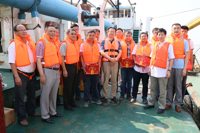 時值“三伏”盛夏、酷暑難耐,7月27日上午建工集團總經(jīng)理劉家靜、工會主席徐曉光等一行頂著炎炎烈日、不辭辛勞,來到正在青弋江河道中進行河道清淤的“蛟龍?zhí)枴蓖谀啻希瑸檎诖鲜┕ぷ鳂I(yè)的船員們帶來關(guān)懷關(guān)愛、送來防暑降溫物品。集團公司總經(jīng)理助理、工程管理部主任童宗勝,集團工會副主席吳曉伍,安徽交航董事長、黨委書記、總經(jīng)理李世龍等陪同慰問。