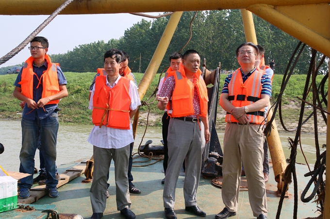 在交通艇上,劉總認真聽取了安徽交航青弋江疏浚項目的詳細介紹,了解了施工進度和下一步施工計劃。登船后與船員們一一握手、親切交談,詢問他們生活飲食情況、防暑降溫措施,隨后登上船舶操作室,詳細了解挖泥船施工技術(shù),通過GPS定位觀察位于水下的施工作業(yè)面積。劉總囑咐船員們在船上作業(yè)要注意安全,在酷暑天氣保障生產(chǎn)進度的同時切實做好防暑降溫工作,確保健康防暑、平安防暑。