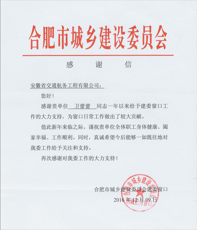 合肥市建委窗口向安徽交航發(fā)來(lái)感謝信