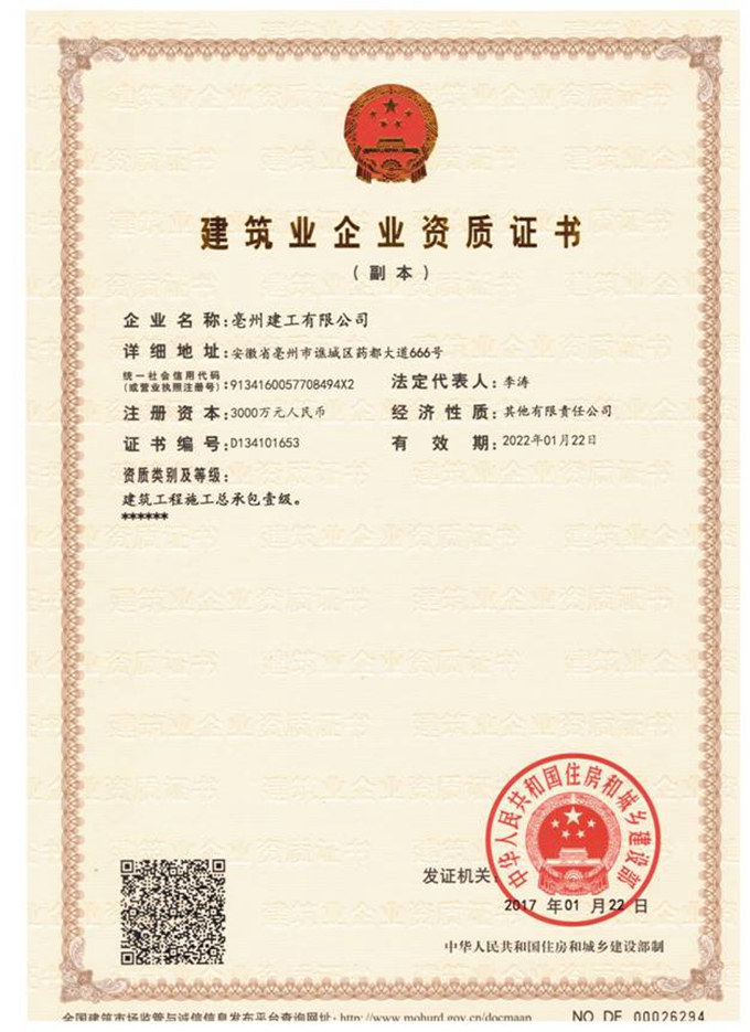 近日,經(jīng)省住建廳初審、住建部專家認(rèn)真評(píng)審公示公告后,亳州建工有限公司成功晉升“建筑工程施工總承包壹級(jí)資質(zhì)”,實(shí)現(xiàn)了企業(yè)施工總承包資質(zhì)水平的提升,為企業(yè)實(shí)現(xiàn)“十三五規(guī)劃發(fā)展目標(biāo)”奠定堅(jiān)實(shí)基礎(chǔ)。