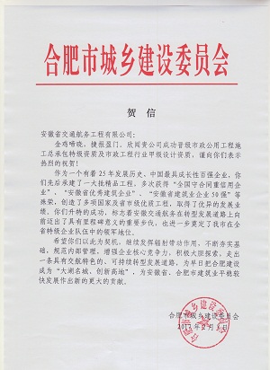 近日,合肥市建委向安徽交航發(fā)來賀信,熱烈祝賀安徽交航市政公用工程施工總承包特級(jí)資質(zhì)及市政行業(yè)甲級(jí)設(shè)計(jì)資質(zhì)。