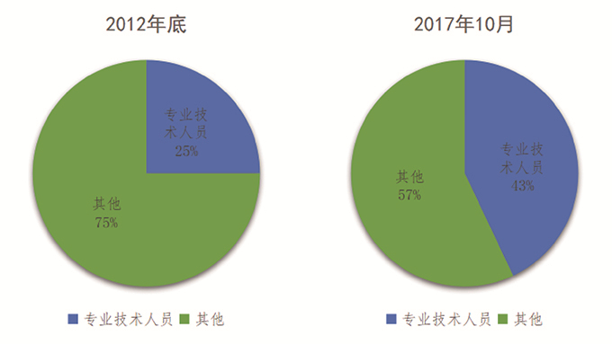 從實(shí)際出發(fā)、砥礪前行,職工結(jié)構(gòu)化素質(zhì)水平穩(wěn)步提升。第一次黨代會(huì)以來,公司人員隊(duì)伍規(guī)模快速增長(zhǎng)。截至2017年10月初,公司職工總數(shù)近500人,與第一次黨代會(huì)職工總?cè)藬?shù)相比,增加近200人,增幅達(dá)到63.7%。其中,專業(yè)技術(shù)人員由不足百人增長(zhǎng)到近200人,增長(zhǎng)比例183.9%。經(jīng)過優(yōu)化,職工隊(duì)伍結(jié)構(gòu)更趨合理,專業(yè)技術(shù)人員職工總量的比例由原來的25%提高到43%。
