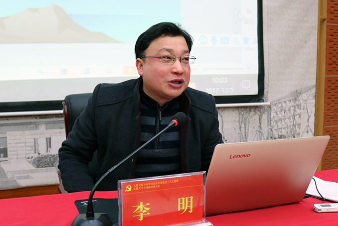 黨的十九大精神安徽“百人宣講團”成員、安徽省學(xué)術(shù)和技術(shù)帶頭人后備人選、教育部“全國高校思想政治理論課教學(xué)能手”、安徽大學(xué)馬克思主義學(xué)院教授、博士生導(dǎo)師李明以《把握新時代 領(lǐng)會新思想 開啟新征程》為題,全方位、多角度、深層次解讀了黨的十九大報告。李教授從為什么能夠進(jìn)入新時代、進(jìn)入新時代的意義、新時代的內(nèi)涵、新時代的主要矛盾、新時代的使命等方面闡釋了“新時代”;從形成條件、主要內(nèi)容、基本方略、精神實質(zhì)等方面分析了“新思想”;從戰(zhàn)略安排方面剖析了“新征程”。
