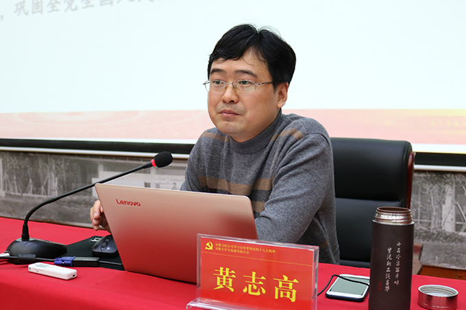黨的十九大精神安徽“百人宣講團”成員、安徽省馬克思主義學(xué)會常務(wù)理事、安徽省科學(xué)社會主義學(xué)會常務(wù)理事、安徽省中共黨史學(xué)會理事、安徽大學(xué)馬克思主義學(xué)院副教授、碩士生導(dǎo)師黃志高以《學(xué)習(xí)黨章 尊崇黨章》為題,從黨章的類型與作用、黨章的演進(jìn)與發(fā)展、黨章的結(jié)構(gòu)與內(nèi)容、黨章的學(xué)習(xí)與尊崇等方面全面、客觀、準(zhǔn)確、透徹地解讀了《中國共產(chǎn)黨章程》。針對黨的十九大修改的黨章條文,黃教授從修改背景、修改意義等方面逐一作了深入闡述。