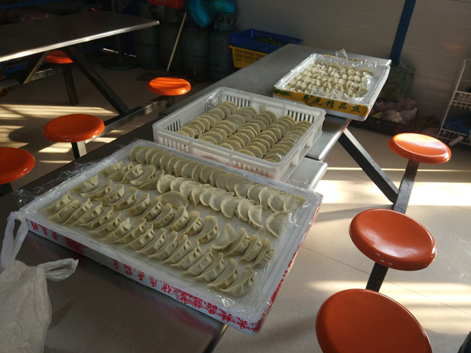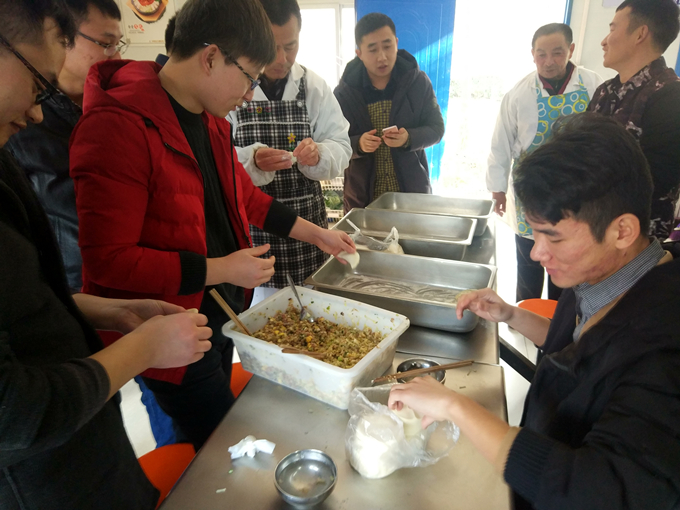 大家分工合作、合理搭配,和面、搟皮、拌餡、包餃子,一派其樂(lè)融融的景象。轉(zhuǎn)瞬之間,一個(gè)個(gè)飽滿誘人的餃子從他們手里如同魔法般冒了出來(lái)。在歡樂(lè)、溫馨的氣氛中,上百多個(gè)餃子新鮮出爐。
