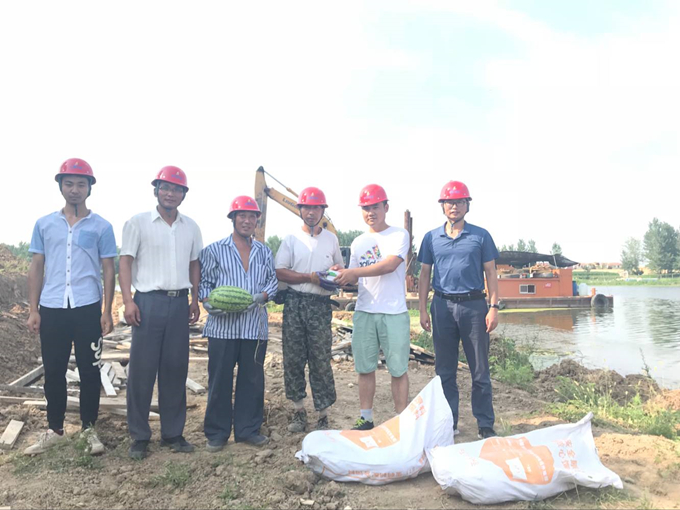 沱澮河項(xiàng)目部領(lǐng)導(dǎo)班子成員前往各施工班組,給正在烈日下作業(yè)的一線工人送去西瓜、仁丹、藿香正氣水等防暑降溫用品,以表示對(duì)各個(gè)崗位上的一線工人在高溫環(huán)境工作的關(guān)懷。并向他們強(qiáng)調(diào),一定要注意防暑降溫,保護(hù)好身體,合理排班,杜絕中暑情況發(fā)生。