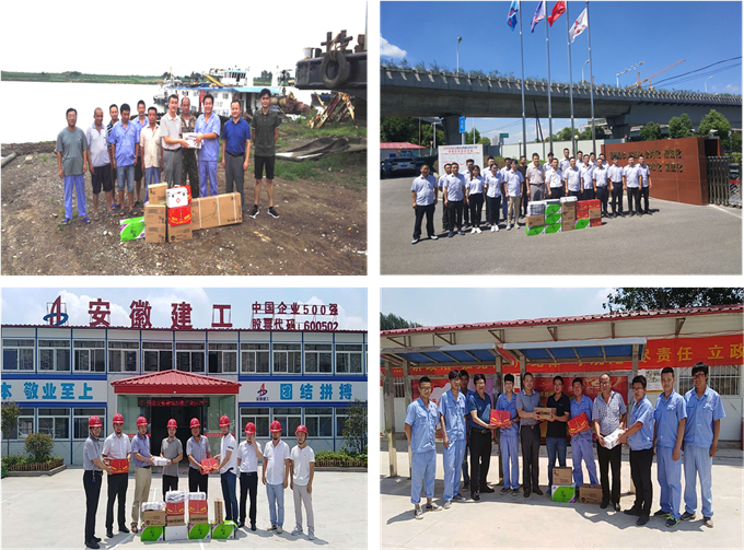 7月19日至8月上旬,公司紀委書記、工會主席李楊,副總經(jīng)理劉朝發(fā)、侯力分別帶隊前往蒙城、淮北、淮南、黃山、蕪湖、合肥等地區(qū)慰問了14個項目部、3個船隊,為奮戰(zhàn)在一線的職工送去防暑降溫用品。因船員工作生活條件艱苦,公司工會額外給3個船隊配備了急救藥箱、健身器材。