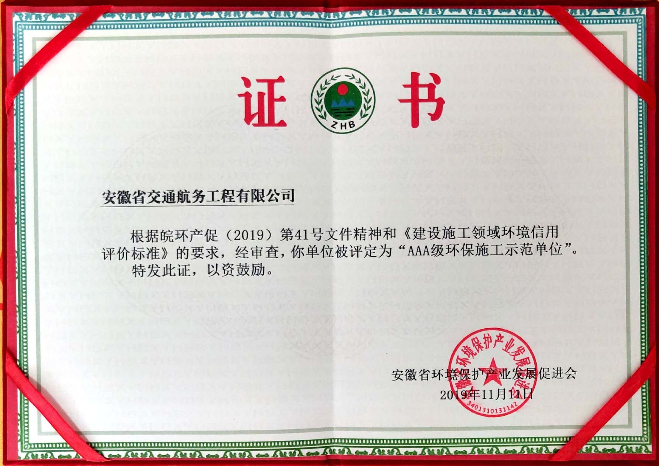 近日,安徽交航公司被安徽省環(huán)境保護產(chǎn)業(yè)發(fā)展促進會評為“AAA級環(huán)保施工示范單位”。