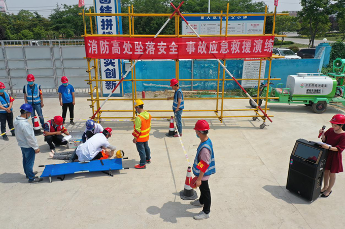 本次演練由項目負責人方成成擔任總指揮,下設警戒組、消防組、救護組、調(diào)查組、后勤保障組五個小組,演練項目分為施工現(xiàn)場消防應急處置演練和高空墜落事故應急救援演練。