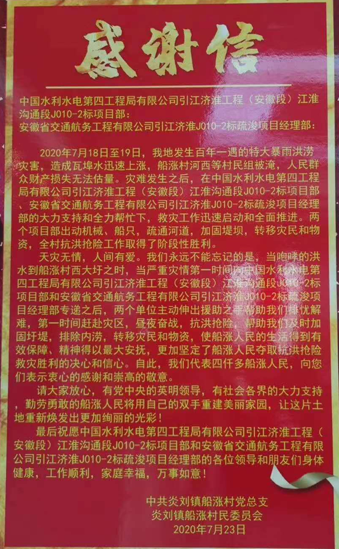 7月23日,中共炎劉鎮(zhèn)船漲村黨總支和炎劉鎮(zhèn)船漲村村民委員會(huì)發(fā)來一封感謝信,信中高度贊揚(yáng)了安徽交航引江濟(jì)淮項(xiàng)目部在參與當(dāng)?shù)乜购榫葹?zāi)工作中的擔(dān)當(dāng)與作為,并且當(dāng)?shù)卮逦€在信中代表四千多位船漲村民表達(dá)了由衷感謝。