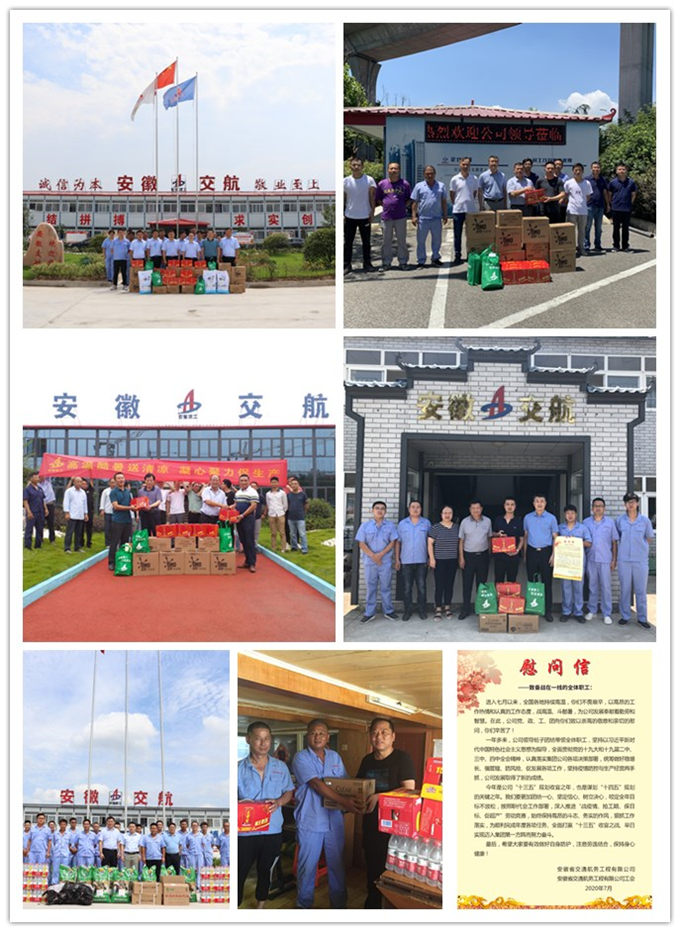 為有效預(yù)防高溫中暑和夏季生產(chǎn)安全事故的發(fā)生,保障廣大職工的生命安全和身體健康,7月中下旬至8月中旬,安徽交航公司開展“送清涼”慰問活動,方申柱、謝玉立、張瓊、劉朝發(fā)、李楊、高偉、董雙武、邵佳等公司領(lǐng)導(dǎo)分赴各子分公司和項目部,為奮戰(zhàn)在高溫酷暑下的一線職工送去了“夏日清涼”,送上了慰問和關(guān)懷,并對職工們不懼驕陽、不畏酷暑的敬業(yè)工作表達(dá)了感謝。