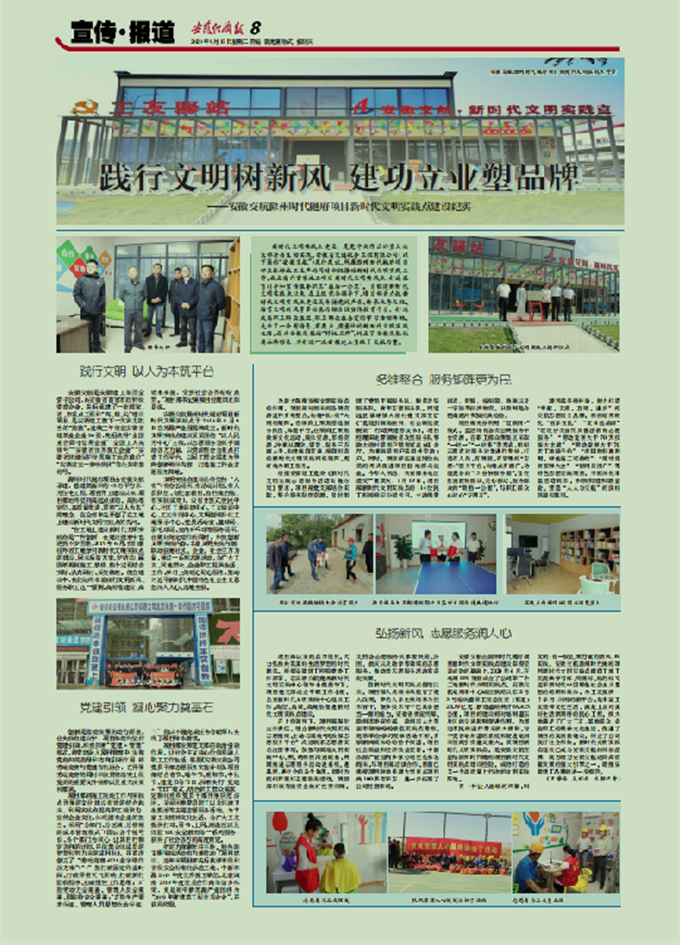 與此同時,公司還積極向集團及省級主流媒體推報公司防汛救災復重建、堅持高質量發(fā)展以及“十四五”規(guī)劃編制等經(jīng)驗做法,深入宣傳公司內(nèi)在學習宣傳貫徹工作中涌現(xiàn)出的先進典型,不斷把學習宣傳工作引向深入。在今年防汛抗洪救災中,公司的防汛救災工作被省級主流媒體中安在線深入報道,徐鑫、田龍和沈宏三位同志被評為“最美志愿者”并在公司網(wǎng)上刊發(fā)了他們先進抗洪事跡。大力實施基層黨建“領航”計劃,《安徽經(jīng)濟報》于9月15日對公司滁州時代樾府項目新時代文明點典型經(jīng)驗做法,用了整版進行專題報道。