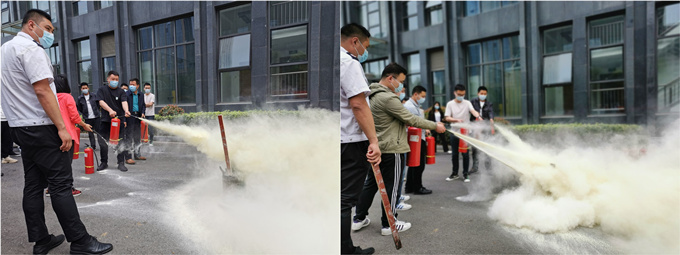 培訓結束后,公司組織職工在一樓西側廣場開展消防應急救援演練活動。