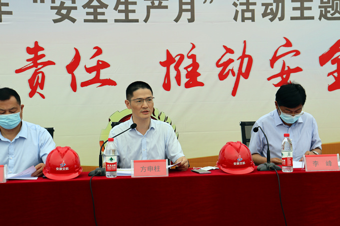 5月31日上午8點,安徽交航2021年“安全生產(chǎn)月”活動啟動暨宣誓儀式在引江濟淮項目部舉行。公司黨委書記、董事長、總經(jīng)理方申柱出席儀式并講話,公司主要領(lǐng)導、各部室負責人、業(yè)主方代表、監(jiān)理方代表、班組作業(yè)代表、引江濟淮項目人員以及參賽隊員等參加。公司副總經(jīng)理董雙武主持儀式。
