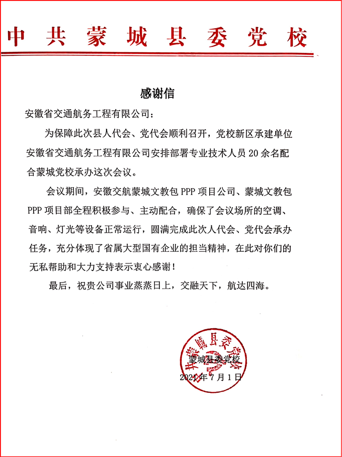 會議期間,蒙城文教包PPP項目公司、蒙城文教包PPP項目部安排20余名專業(yè)技術(shù)人員全程積極參與、主動配合,周密部署、精心安排,以“嚴之又嚴、細之又細、實之又實、全之又全”的態(tài)度,派駐專業(yè)技術(shù)人員24小時對會場的空調(diào)、音響、燈光等設(shè)備進行維護調(diào)試,保障了會議期間會場設(shè)備安全運行,圓滿完成了此次人代會和黨代會承辦任務(wù)。為此,蒙城縣委黨校發(fā)來感謝信,對蒙城項目公司的全力配合和無私幫助表示感謝,并祝安徽交航事業(yè)蒸蒸日上。