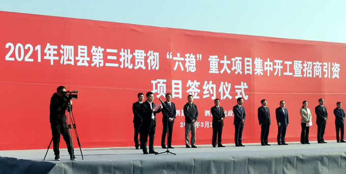 3月26日上午,由泗縣2021年第三批貫徹“六穩(wěn)”重大項目集中開工暨招商引資項目簽約儀式在安徽交航參建的泗縣長三角綠色農(nóng)產(chǎn)品加工物流產(chǎn)業(yè)園施工現(xiàn)場舉行。宿州市市委常委、泗縣縣委書記張志強(qiáng),宿州市政協(xié)副主席、泗縣縣委副書記、縣長王法立,縣委副書記王汝娜及泗縣農(nóng)業(yè)農(nóng)村局等領(lǐng)導(dǎo)出席開工儀式。公司財務(wù)總監(jiān)高偉應(yīng)邀出席,并與泗縣主要領(lǐng)導(dǎo)共同為項目奠基。