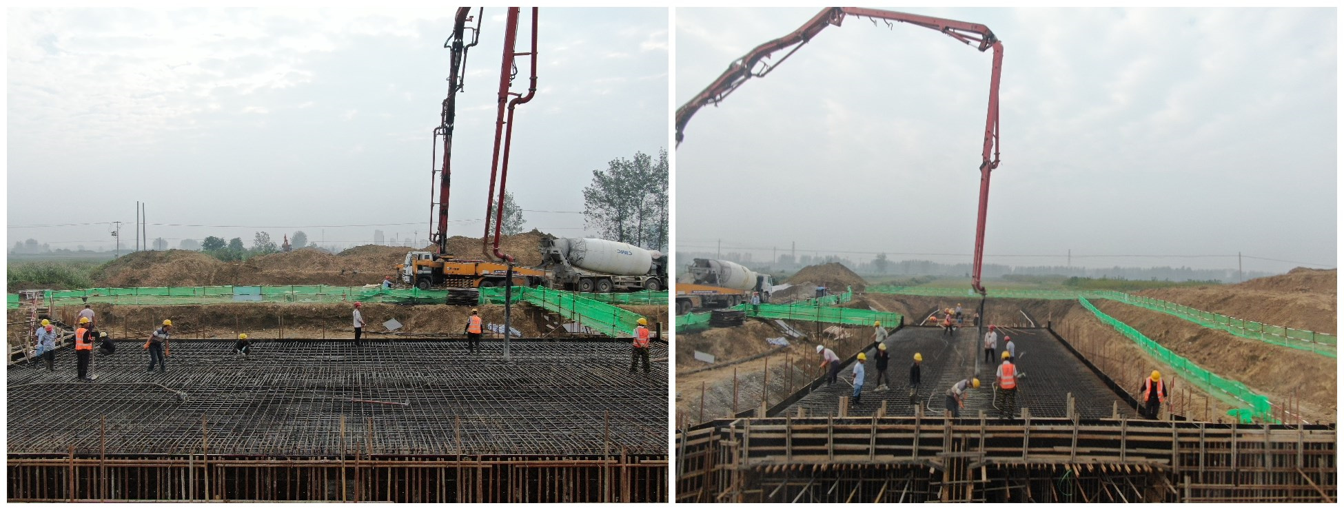 自儀式啟動以來,為快速掀起大干快干熱潮,確保年底完成既定進度產(chǎn)值,泗縣長三角產(chǎn)業(yè)園項目緊緊圍繞項目年度生產(chǎn)任務(wù),秉持“工期就是效益”的理念,主動對標長三角一體化發(fā)展城鄉(xiāng)建設(shè)示范性勞動和技能競賽,充分發(fā)揮主人翁精神和主力軍作用,確保項目工期、產(chǎn)值等各項任務(wù)圓滿實現(xiàn)。今年9月9日,在炎熱高溫天氣下,泗縣長三角產(chǎn)業(yè)園項目龍河路箱涵,在超長雨季間歇期完成的底板混凝土澆筑、頂板及側(cè)墻鋼筋綁扎、模板支設(shè),經(jīng)過監(jiān)理單位驗收合格,終于迎來了頂板及側(cè)墻混凝土的澆筑。由于混凝土澆筑方量大,項目部提前向商混站報備所需泵車、混凝土標號、方量,預(yù)計澆筑時間等計劃。9日清晨6點鐘,項目部技術(shù)管理人員到達磅房和施工位置,指揮泵車過磅,安排工人測溫及班前培訓(xùn)。在施工過程中,項目部技術(shù)管理人員時刻與工人一起,送藥送水,極大地鼓舞了廣大工人的生產(chǎn)熱情,經(jīng)過八個小時連續(xù)奮戰(zhàn),澆筑任務(wù)圓滿完成。