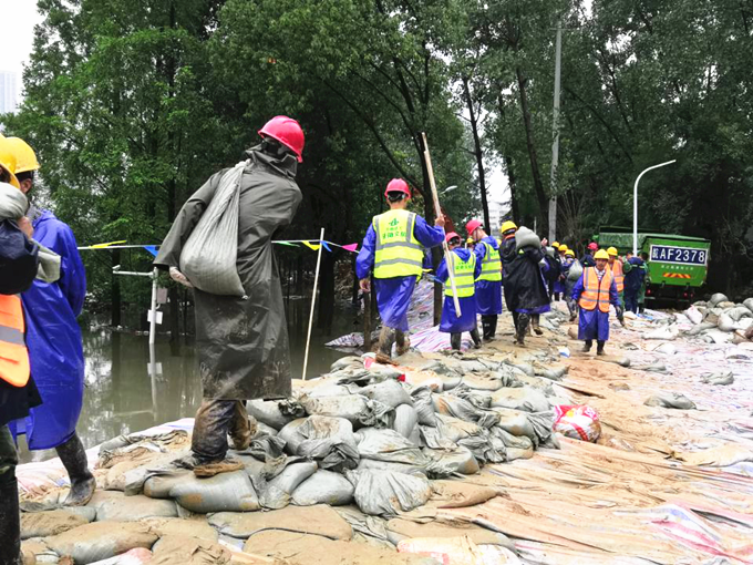 項目黨支部書記田龍全程指揮防汛抗洪工作,大家分工明確,積極主動投身到防汛抗洪的工作中,一鍬一鍬挖,一袋一袋堆,扎出成百上千個沙包,堵在南淝河堤壩地勢低洼處,形成一道堅實的防線,幫助當?shù)厣鐓^(qū)排除險情。