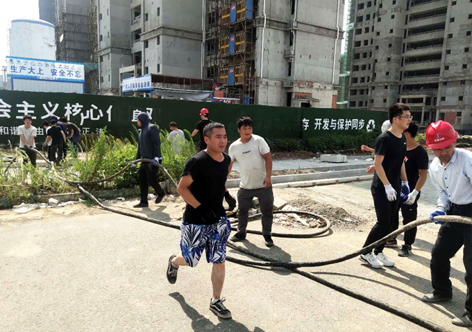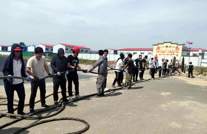 當(dāng)日上午9:30,項(xiàng)目部全體黨員及管理人員頂著炎炎烈日,將電纜從施工現(xiàn)場(chǎng)鋪設(shè)至勞務(wù)工人生活區(qū),全長(zhǎng)兩百余米。電纜如同一條游龍,在大家的手中緩緩移動(dòng)。“一二三、一二三”響亮的口號(hào)聲不斷響起,大家團(tuán)結(jié)一致,一米一米將電纜向指定的位置拉移。在30多度的高溫天氣下,在項(xiàng)目部全體員工的共同努力下,經(jīng)過(guò)1個(gè)多小時(shí)的奮戰(zhàn),終于順利完成電纜鋪設(shè)任務(wù),保障了勞務(wù)工人的生活供電。