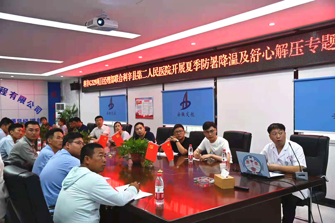 培訓(xùn)環(huán)節(jié),項(xiàng)目部特邀利辛縣第二人民醫(yī)院楊文成醫(yī)生,就開展夏季防暑降溫及舒心解壓知識(shí)進(jìn)行了專題講座。楊文成醫(yī)生,先是就中暑的原因、發(fā)病機(jī)理做一個(gè)簡單講解,然后針對(duì)以上原因、如何預(yù)防以及應(yīng)急方式做了一個(gè)細(xì)致說明。