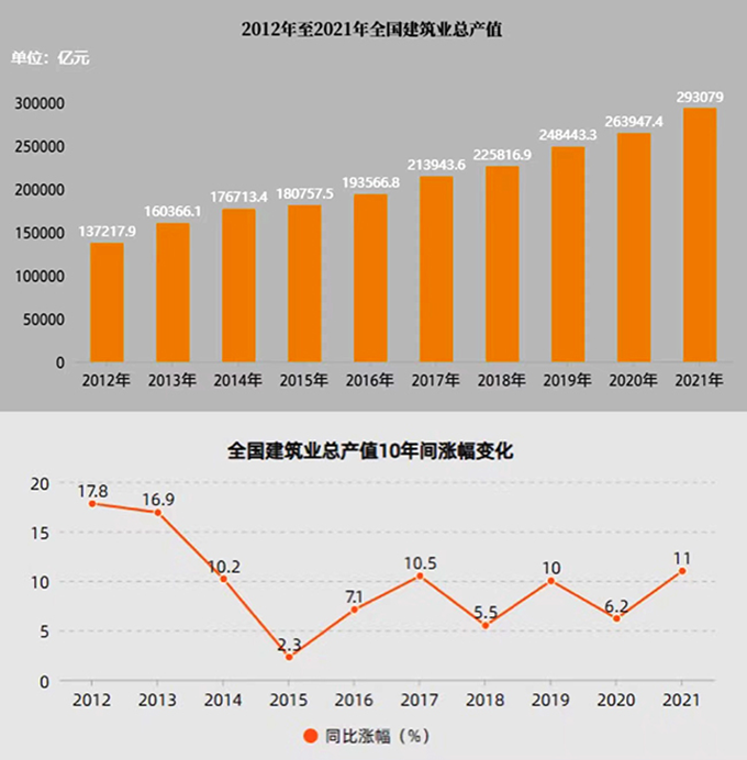 近年來,隨著我國建筑業(yè)企業(yè)生產(chǎn)和經(jīng)營規(guī)模的不斷擴大,建筑業(yè)總產(chǎn)值持續(xù)增長。數(shù)據(jù)顯示,從2012年到2021年,我國建筑業(yè)總產(chǎn)值從137217.9億元持續(xù)上漲至293079億元,十年間總產(chǎn)值增加了一倍以上。