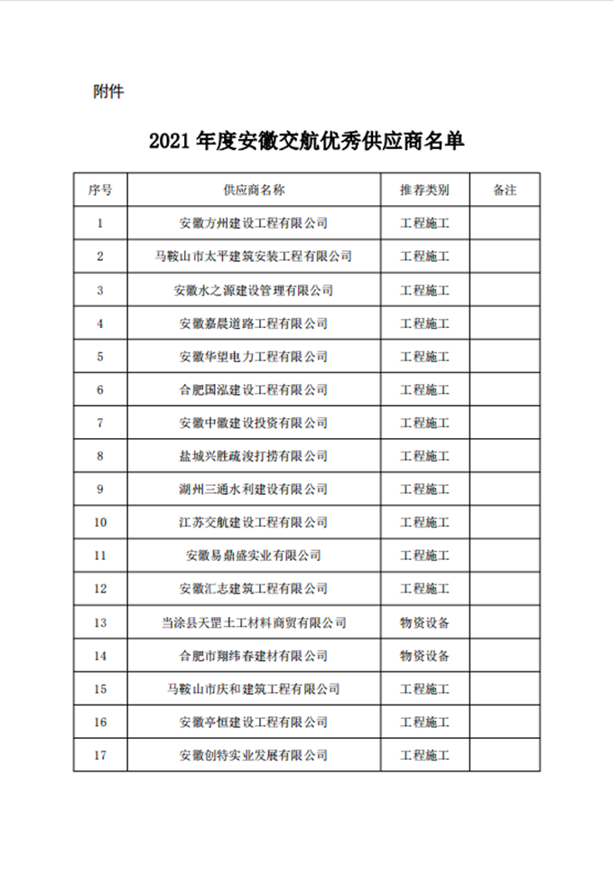 為進一步規(guī)范公司供應商管理,提高供應商履約意識,促進建立長期穩(wěn)定的供應商合作關系,根據(jù)《安徽建工集團股份有限公司供應商管理辦法》、《安徽省交通航務工程有限公司供應商管理辦法》等有關規(guī)定,經(jīng)所屬單位按照優(yōu)秀供應商入庫條件并考核推薦,公司審核并報總辦會審議通過。現(xiàn)公布2021年度公司優(yōu)秀供應商名單。
