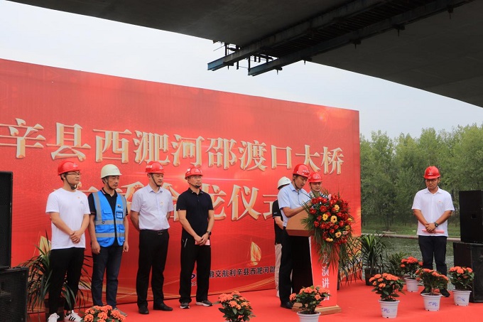 金秋九月結(jié)碩果,丹桂飄香迎佳績(jī)。9月14日下午3點(diǎn)18分在項(xiàng)目部施工現(xiàn)場(chǎng)隆重舉行利辛縣西淝河邵渡口大橋主橋合龍儀式。利辛縣交通運(yùn)輸局局長(zhǎng)陳峰、利辛縣安建交通建設(shè)管理有限公司總經(jīng)理劉國(guó)柱、安徽交航第三工程公司總經(jīng)理潘家奎、合肥工大建設(shè)監(jiān)理公司代表陳海波、省工程測(cè)試研究院代表李小剛出席儀式,分包單位代表以及利辛縣各項(xiàng)目部代表等參加合龍儀式。