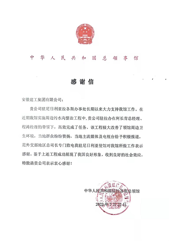 7月22日,安徽建工集團收到中國駐拉各斯總領(lǐng)館感謝信,對安徽建工駐尼日利亞拉各斯辦事處優(yōu)質(zhì)高效完成使館外圍環(huán)保整治工程表示感謝。