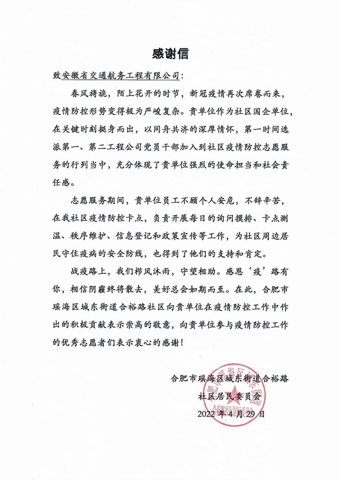 “第一時間選派第一、第二工程公司黨員干部加入到社區(qū)疫情防控志愿服務的行列當中,充分體現(xiàn)了貴單位強烈的使命擔當和社會責任感?!?月29日,公司收到了一封來自合肥市瑤海區(qū)城東街道合裕路社區(qū)的感謝信,信中對公司積極參與社區(qū)疫情防控工作表示由衷感謝。