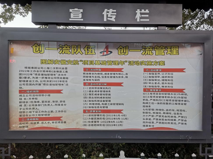 提高思想認識,營造良好學習氛圍。公司“項目基礎管理年”活動方案發(fā)布后,徽州智能制造產(chǎn)業(yè)園項目第一時間召開專題學習會,結(jié)合項目實際情況,制定了徽州智能制造產(chǎn)業(yè)園項目“項目基礎管理年”活動綱要。并在項目部宣傳欄制作專題展板以及施工現(xiàn)場懸掛相關標語橫幅,廣泛宣傳,進一步提高全體項目人員的思想意識。