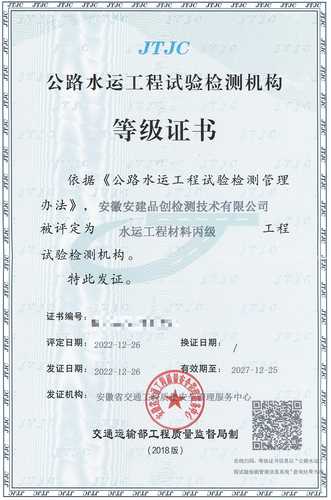 12月26日,品創(chuàng)檢測(cè)公司榮獲水運(yùn)工程材料丙級(jí)資質(zhì),此次丙級(jí)資質(zhì)的取得標(biāo)志著品創(chuàng)檢測(cè)公司“十四五”發(fā)展規(guī)劃邁上新臺(tái)階,同時(shí)也為進(jìn)一步提升水運(yùn)行業(yè)等級(jí)資質(zhì)以及開拓水運(yùn)工程檢測(cè)領(lǐng)域奠定了堅(jiān)實(shí)的基礎(chǔ)。