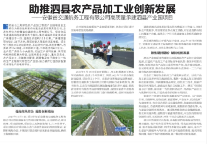 近日,新安晚報社重點報道安徽交航公司高質(zhì)量承建泗縣產(chǎn)業(yè)園項目,助推泗縣農(nóng)產(chǎn)品加工業(yè)創(chuàng)新發(fā)展。