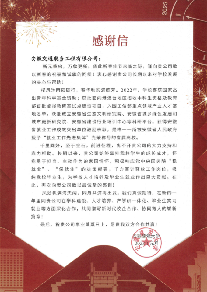 1月19日,安徽交航公司收到安徽建筑大學發(fā)來的感謝信。信中表示,安徽交航公司長期以來吸納安徽建筑大學畢業(yè)生,為學校人才培養(yǎng)及畢業(yè)生就業(yè)作出巨大貢獻,特向我公司表示感謝。
