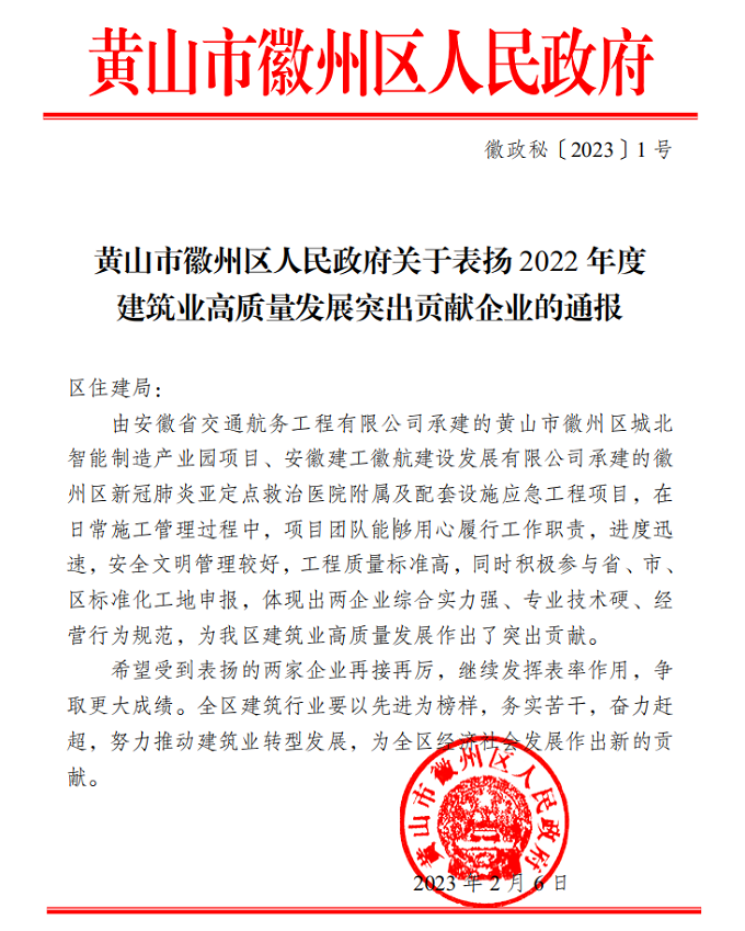 近日,黃山市徽州區(qū)人民政府發(fā)文通報(bào)表?yè)P(yáng)我公司承建的徽州區(qū)產(chǎn)業(yè)園項(xiàng)目及徽州區(qū)新冠肺炎亞定點(diǎn)救治醫(yī)院項(xiàng)目。