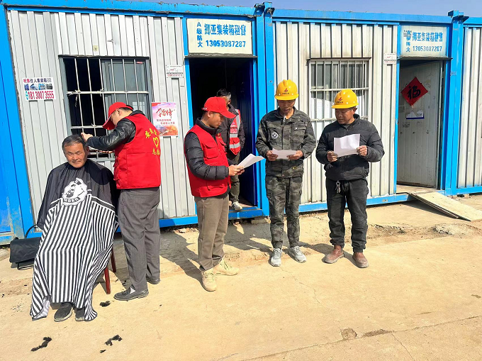 潭沖河家園項目發(fā)動青年志愿者們?yōu)轫椖抗と税l(fā)放文明宣傳手冊,講解宣傳合肥市民公約(守則),同時團支部組織志愿者服務活動,為工人提供義務理發(fā)。