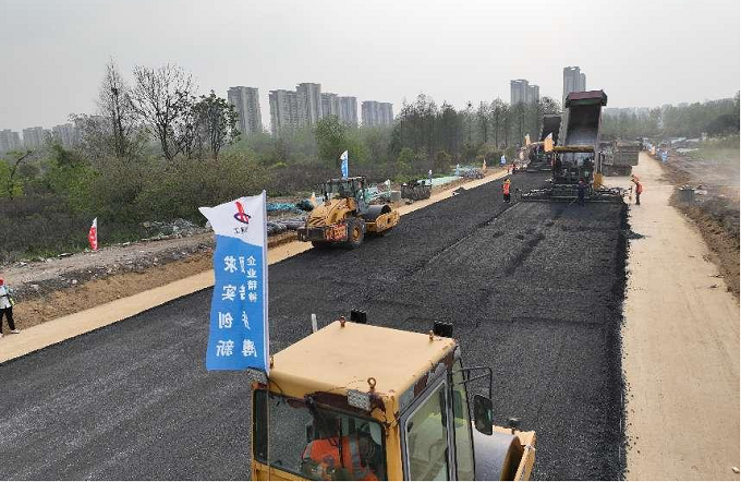 4月11日中午,青海路項(xiàng)目施工現(xiàn)場機(jī)械轟鳴、彩旗飄揚(yáng),項(xiàng)目道路水泥穩(wěn)定碎石試驗(yàn)段順利動工,大型攤鋪機(jī)、壓路機(jī)、輸料車輛忙碌而有序地實(shí)施鋪設(shè)作業(yè),一條灰色的路面慢慢向前延伸。