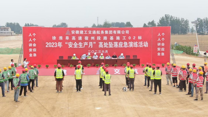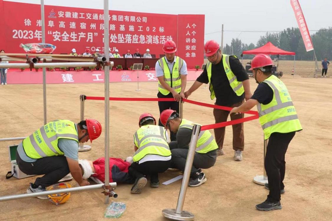 為檢驗項目部應(yīng)對突發(fā)安全事故的應(yīng)急救援能力,提高應(yīng)急救援水平。6月16日上午,第三工程公司徐淮阜高速宿州段02標項目部開展“人人講安全,個個會應(yīng)急”為主題的高處墜落事故應(yīng)急預(yù)案演練,進一步提高項目部人員的安全防范意識和應(yīng)急處置能力。