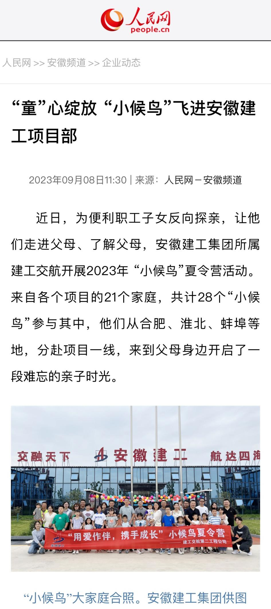 人民網(wǎng)安徽頻道以《“童”心綻放“小候鳥”飛進安徽建工項目部》為題,報道建工交航“小候鳥”夏令營活動。