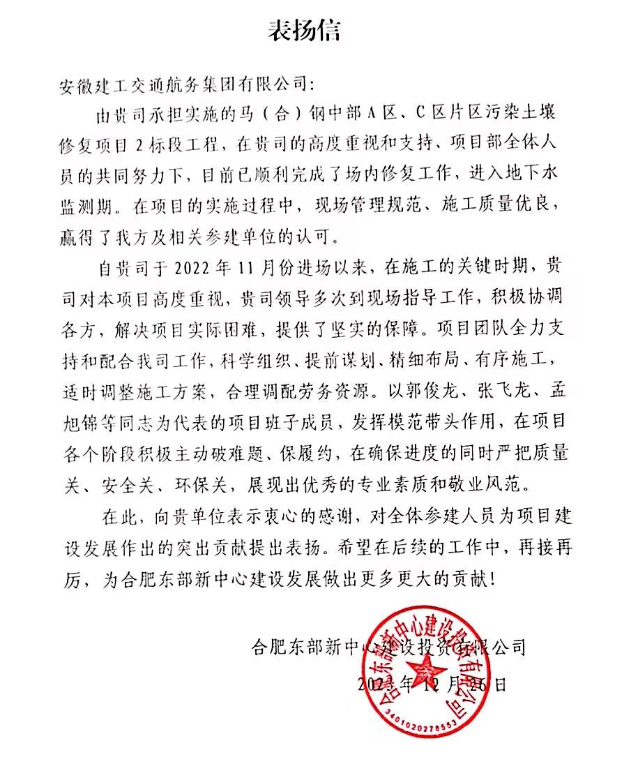 馬(合)鋼中部A區(qū)、C區(qū)片區(qū)污染土壤修復(fù)項目2標段工程積極主動破難題、保履約,提前謀劃、精心布局、有序施工,嚴把質(zhì)量關(guān)、安全關(guān)和環(huán)保關(guān),展現(xiàn)出優(yōu)秀的專業(yè)素養(yǎng)和敬業(yè)風(fēng)范,收獲業(yè)主單位合肥東部新中心建設(shè)投資有限公司表揚。