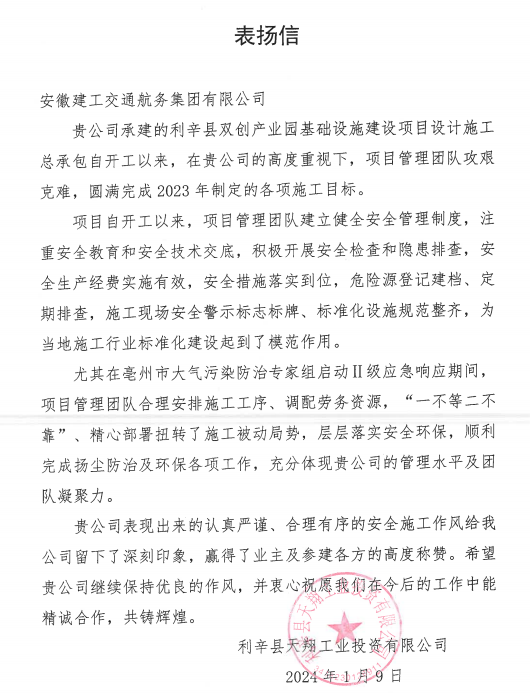 近日,公司承建的馬(合)鋼項目、S210豐樂大道全椒段接合寧高速公路互通立交項目和利辛雙創(chuàng)產(chǎn)業(yè)園項目喜獲表揚信。