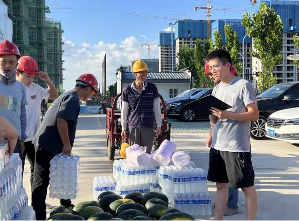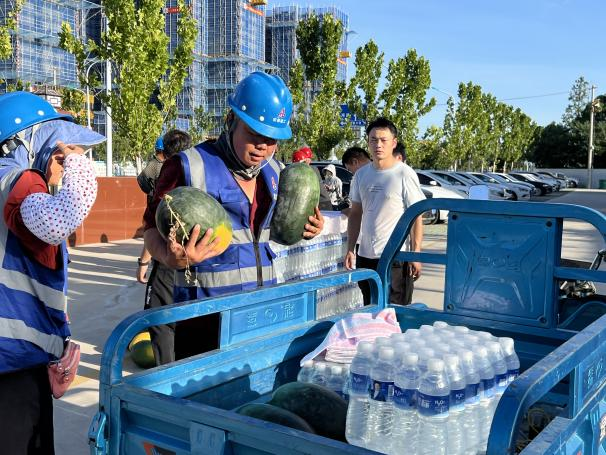 活動(dòng)現(xiàn)場,項(xiàng)目部為現(xiàn)場一線工人代表送上了礦泉水、西瓜、藥品等防暑降溫物品,向他們表示親切問候,感謝他們一直以來的辛苦付出,叮囑他們在高溫天氣下要注意勞逸結(jié)合、做好防護(hù),確保自身健康和安全。