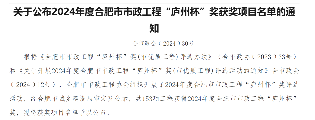 近日,經(jīng)合肥市城鄉(xiāng)建設(shè)局審定,合肥市市政工程協(xié)會正式公布2024年度合肥市市政工程“廬州杯”獲獎(jiǎng)項(xiàng)目名單,我公司承建的瑤海區(qū)板橋河初期雨水徑流污染控制工程項(xiàng)目順利通過評審,榜上有名。