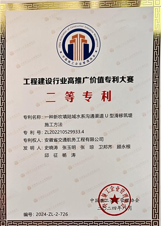 在工程建設(shè)行業(yè)高推廣價值專利大賽中,公司申報(bào)的“一種新吹填陸域水系溝通渠道U型滑移筑堤施工方法”發(fā)明專利榮獲二等獎。
