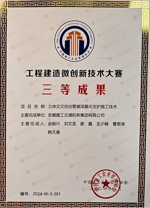 9月9日至11日,中國施工企業(yè)管理協(xié)會召開了第六屆工程建設(shè)行業(yè)科技創(chuàng)新大會,發(fā)布了第四屆工程建設(shè)行業(yè)高推廣價值專利大賽、第四屆工程建造微創(chuàng)新技術(shù)大賽、第二屆工程建設(shè)企業(yè)“數(shù)字化、工業(yè)化、綠色低碳”施工工法大賽的成果,建工交航斬獲多項(xiàng)榮譽(yù)。